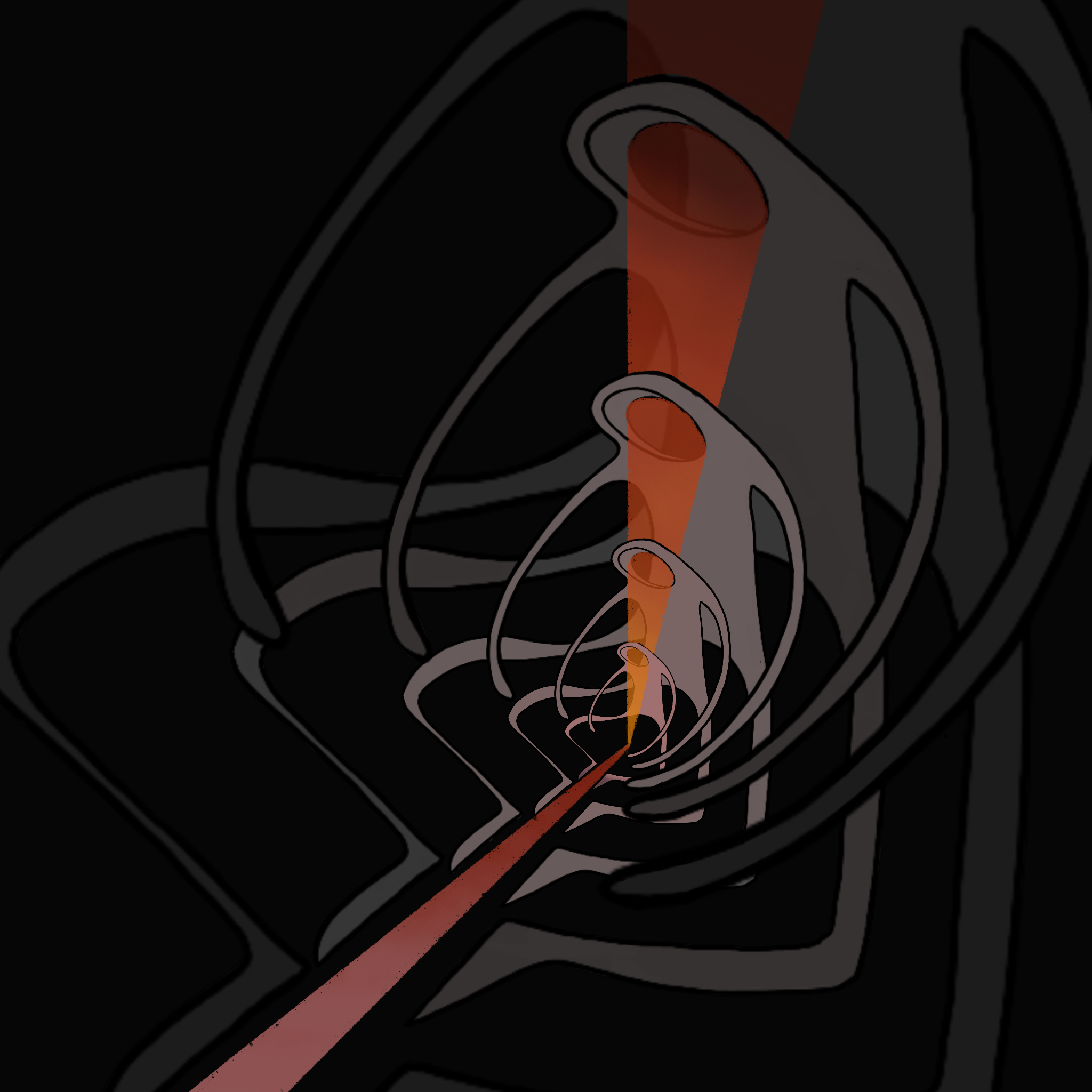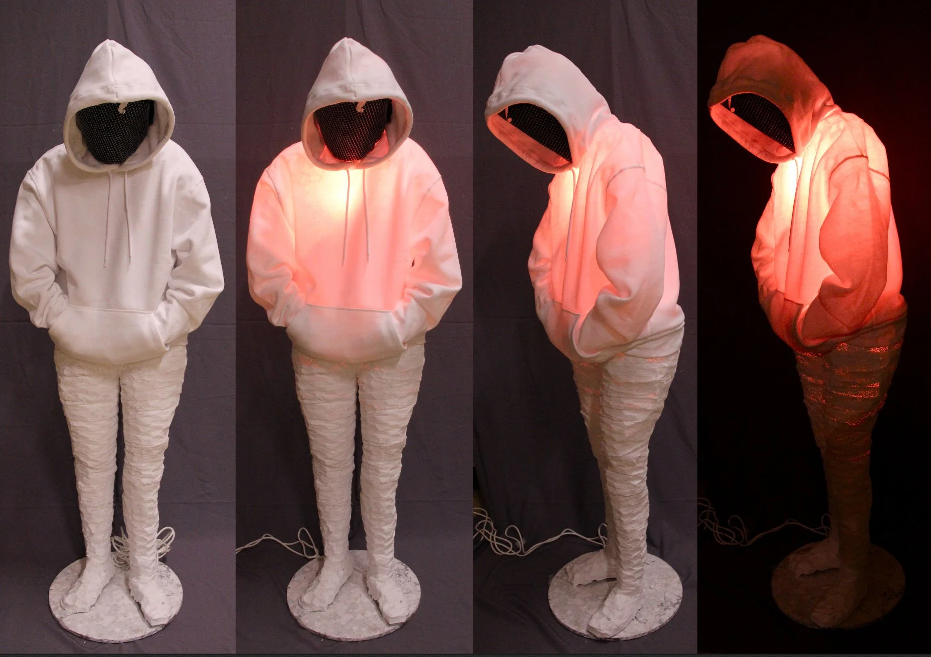 FIRST - stepping into the small, cramped enclosure, the viewer is presented with a red strobe light and sound cancelling headphones to experience the first audio mixture.